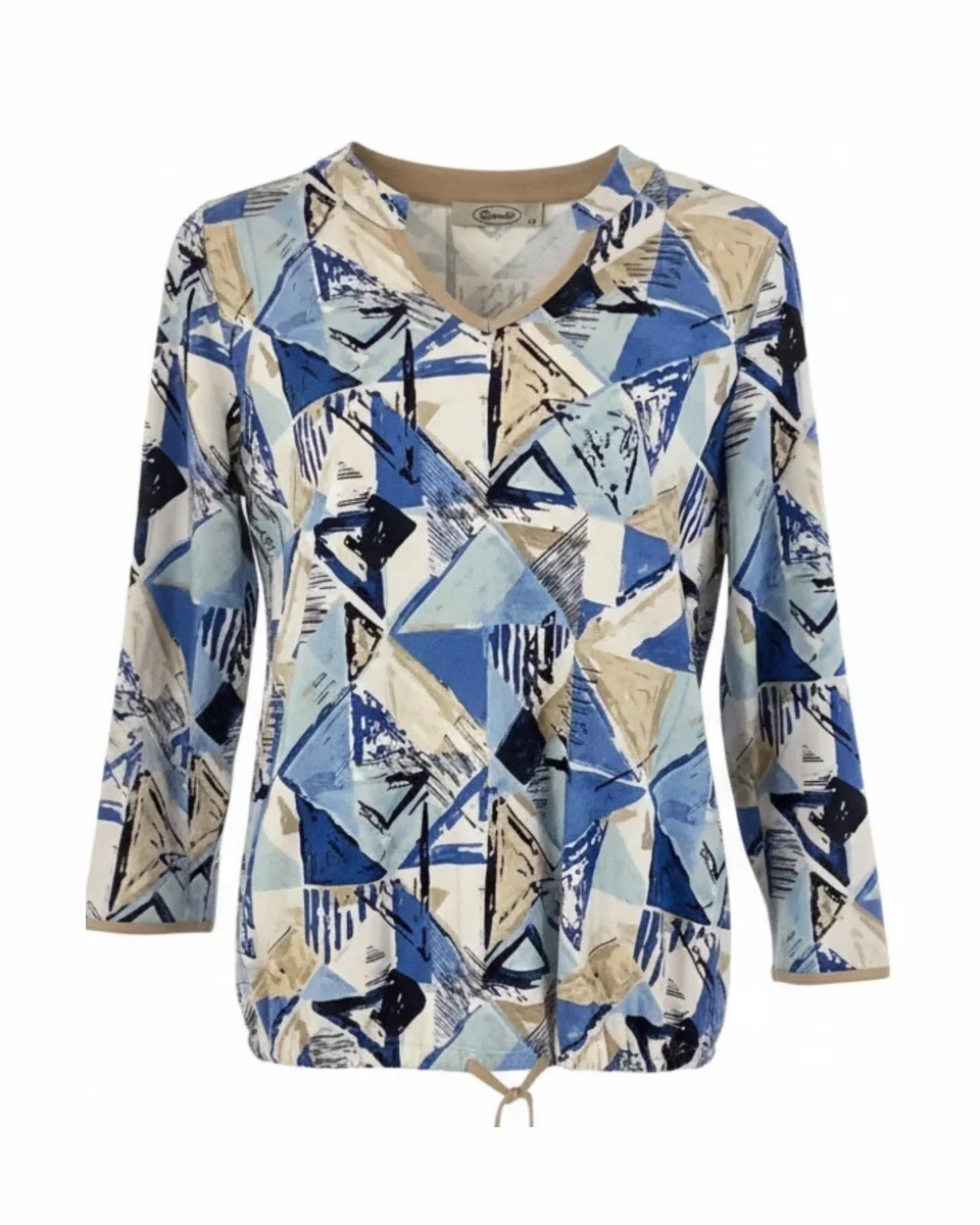 Shirt van Sensia Fashion met een opstaand boordje en een korte, platte V-hals die niet te laag valt. Het shirt heeft een recht model met 3/4 mouwen. Onderaan het shirt is een veter detail verwerkt waarmee het shirt licht aangesnoerd kan worden voor een mooi aansluitende pasvorm. Gemaakt van een fijn zachte jersey kwaliteit met optimaal draagcomfort.