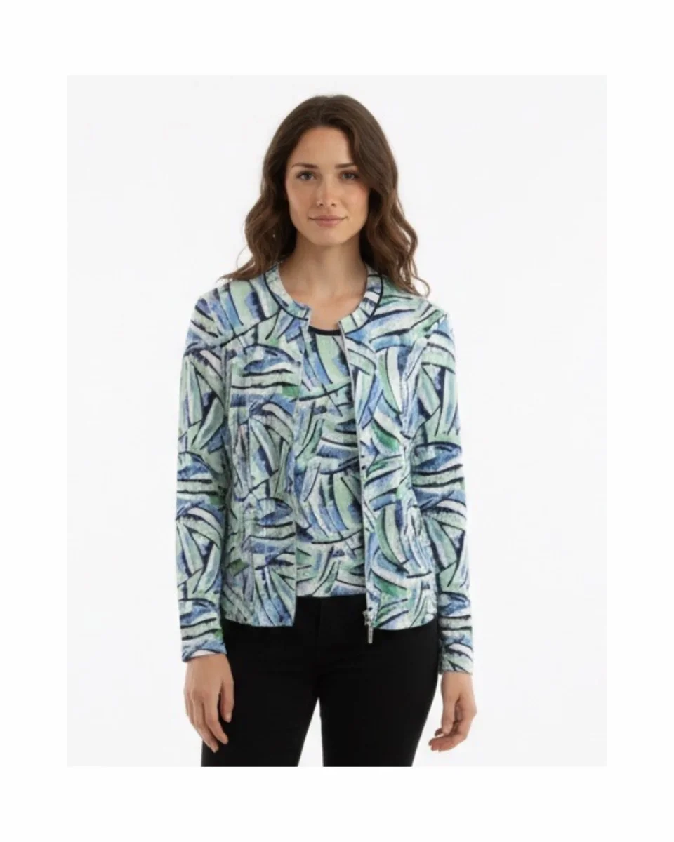 Comfortabele twinset van het merk Sensia Fashion in mooie voorjaarskleuren. Het vest heeft lange mouwen, een recht model en sluit met een rits. De opstaande kraag en de sierlijke stiksels geven het vest een nette, verzorgde uitstraling.