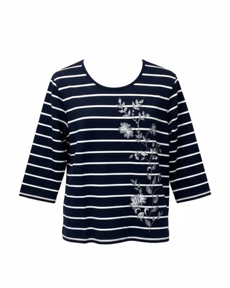 Dit donkerblauwe shirt met ronde hals heeft frisse witte strepen en een mooi bloemen detail voor een speels accent. Dankzij de driekwart mouwen is dit een ideaal shirt voor het tussenseizoen en makkelijk te combineren. Dit artikel valt goed op maat.