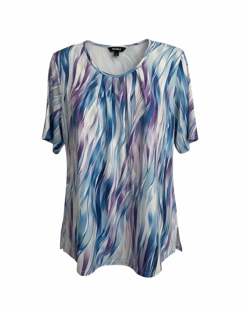 Een comfortabel T-shirt met driekwart mouwen en een mooie ronde halslijn met een subtiel O-detail net onder de hals. De soepele viscose mix voelt zacht aan op de huid en draagt heerlijk licht. Shirt valt recht met splitjes