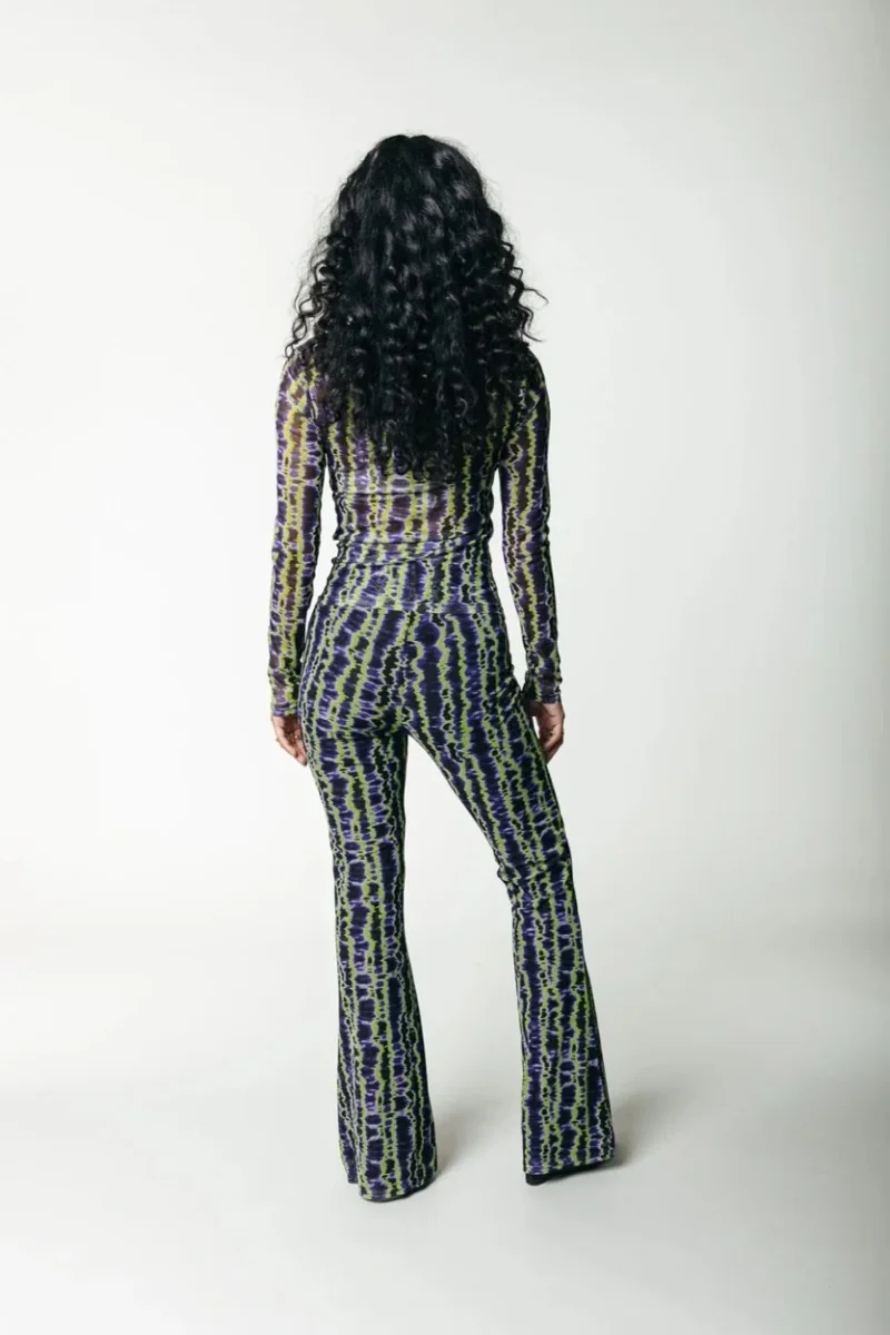 De broek is gemaakt van een hoge kwaliteit mix van 95% polyester en 5% elasthaan, waardoor het een zachte en comfortabele stretch fit heeft. De elastische tailleband zorgt ervoor dat de broek perfect op zijn plek blijft en een optimale pasvorm biedt. De Tie Dye Stripes Mesh Flare Pants van Colourful Rebel is verkrijgbaar in de maten XS tot en met XL.