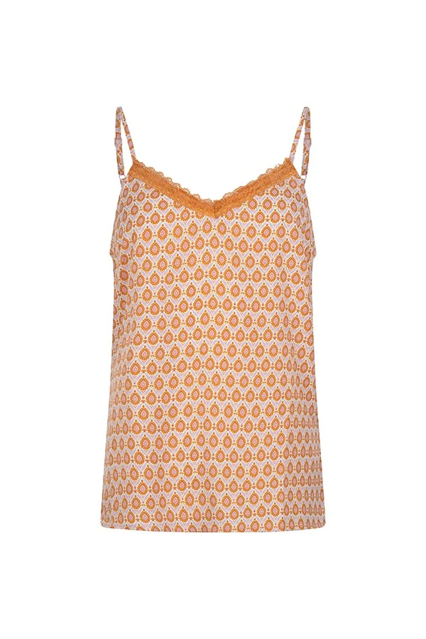 De Lofty Manner Top Alaia is de perfecte toevoeging aan je garderobe voor de warmere dagen. Deze singlet in de opvallende kleur oranje dessin is een echte eyecatcher van de kledingwebshop Nummerzestien. Met verstelbare spaghettibandjes en een met kant afgewerkte v-hals zorgt deze top voor een vrouwelijke en stijlvolle look. De rechtvallende pasvorm maakt het zowel geschikt voor een casual als een meer geklede outfit.