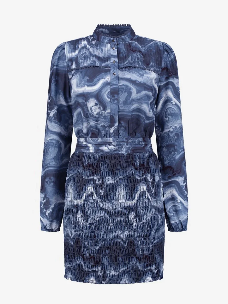 De Nikkie Veronica Marble jurk is een must-have voor fashion-forward dames. Deze prachtige jurk heeft lange mouwen en een korte lengte, waardoor je jouw vrouwelijke silhouet kunt laten zien. Het blauwe dessin van deze jurk is geïnspireerd op een marmerprint en zorgt voor een moderne en stijlvolle look. De jurk heeft een knoopsluiting tot aan de taille, waardoor je jouw taille kunt accentueren en vanaf daar loopt de jurk over in smock. Dit zorgt voor een speels en vrouwelijk effect.