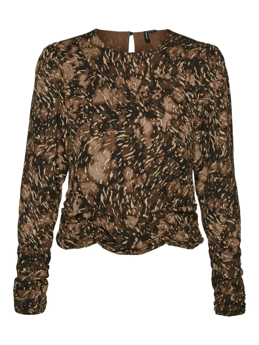 Upgrade je garderobe met deze prachtige top van Vero Moda, verkrijgbaar in een trendy bruin dessin. Perfect voor zowel alledaagse outfits als voor speciale gelegenheden. Deze top is gevoerd en uitgerust met lange mouwen en een elegante ronde hals met keyhole detail aan de achterzijde. De mouwen zijn afgewerkt met smokwerk, wat zorgt voor een speelse touch. De onderzijde van de top is voorzien van geplooide details en heeft een subtiel ritsdetail aan de linkerzijnaad. De allover print maakt deze top extra bijzonder. Gemaakt van duurzaam materiaal, namelijk 68% gerecycled polyester en 32% polyester, en de voering is 100% polyester. Bestel nu en voeg deze must-have top toe aan je collectie!