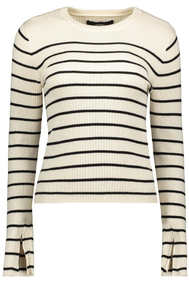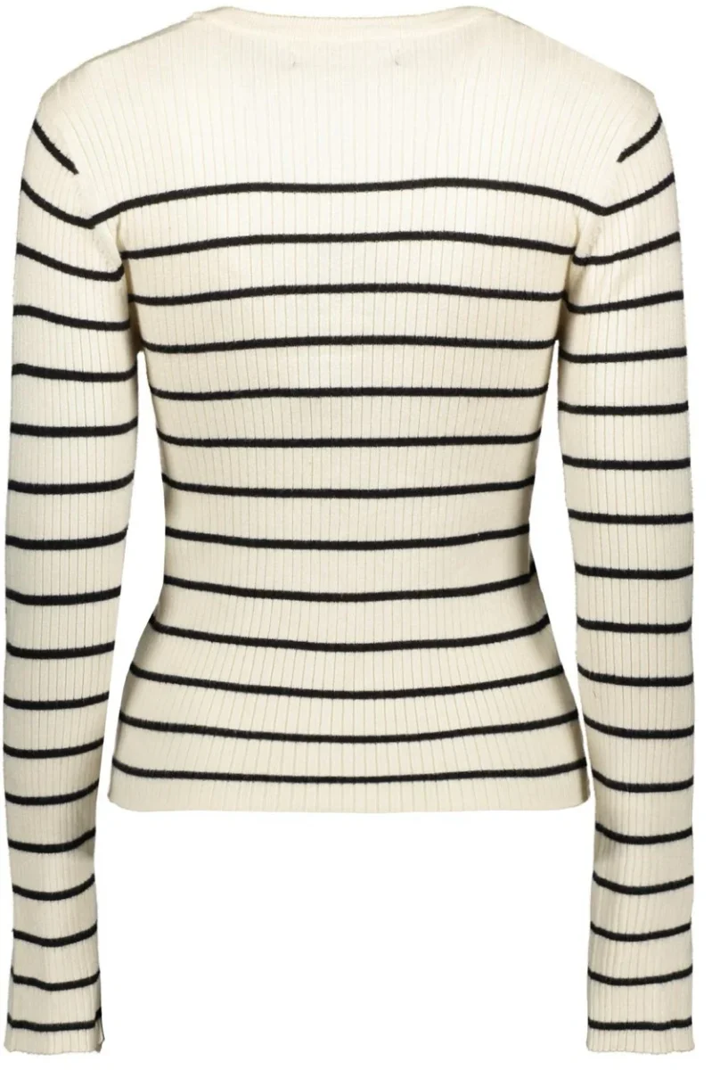 De trui heeft een prachtig ribpatroon in de kleuren wit en zwart, wat zorgt voor een speelse en elegante look. Deze zandkleurige trui is perfect voor elke gelegenheid en kan zowel casual als gekleed gedragen worden. De slim fit pasvorm zorgt ervoor dat de trui mooi aansluit op het lichaam en jouw figuur prachtig laat uitkomen.