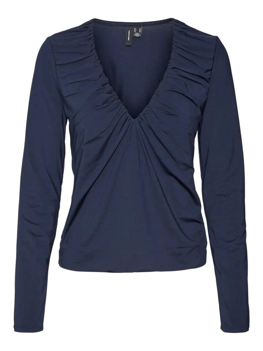 De perfecte toevoeging aan elke kledingkast: het navy kleurige t-shirt l/m voor dames van Vero Moda. De Galina top is gemaakt van een mix van 50% gerecycled polyester en 50% polyester, waardoor het niet alleen stijlvol maar ook milieuvriendelijk is. Het soepele materiaal zorgt voor een comfortabele pasvorm en de navy kleur is makkelijk te combineren met verschillende outfits. Of je het nu draagt op een jeans voor een casual look of op een rok voor een meer geklede outfit, dit t-shirt is een echte must-have voor elke gelegenheid. Bestel nu jouw Vero Moda Galina navy t-shirt en voeg een vleugje stijl en duurzaamheid toe aan jouw garderobe!