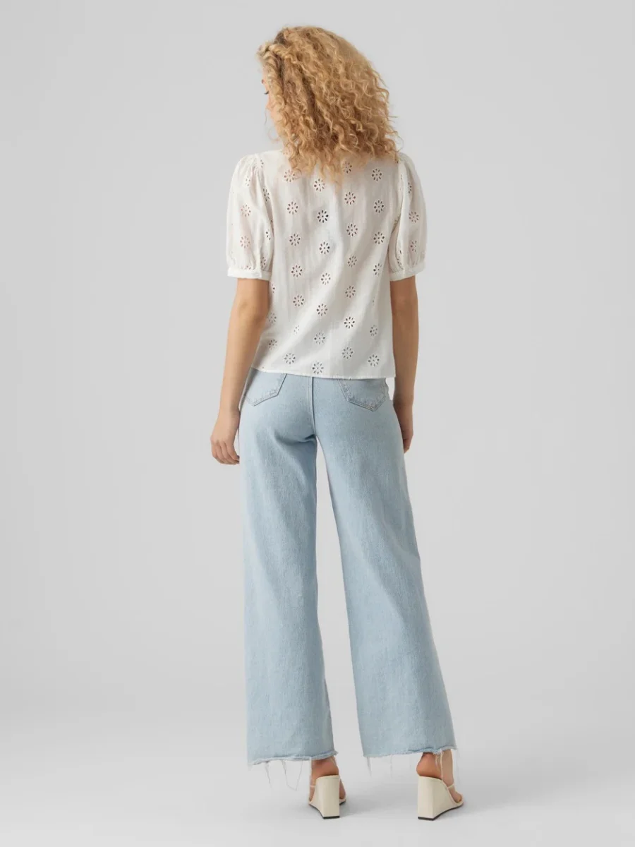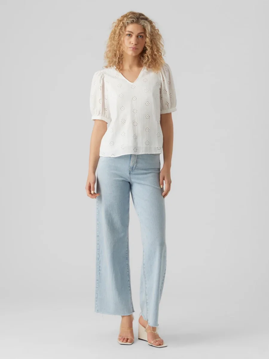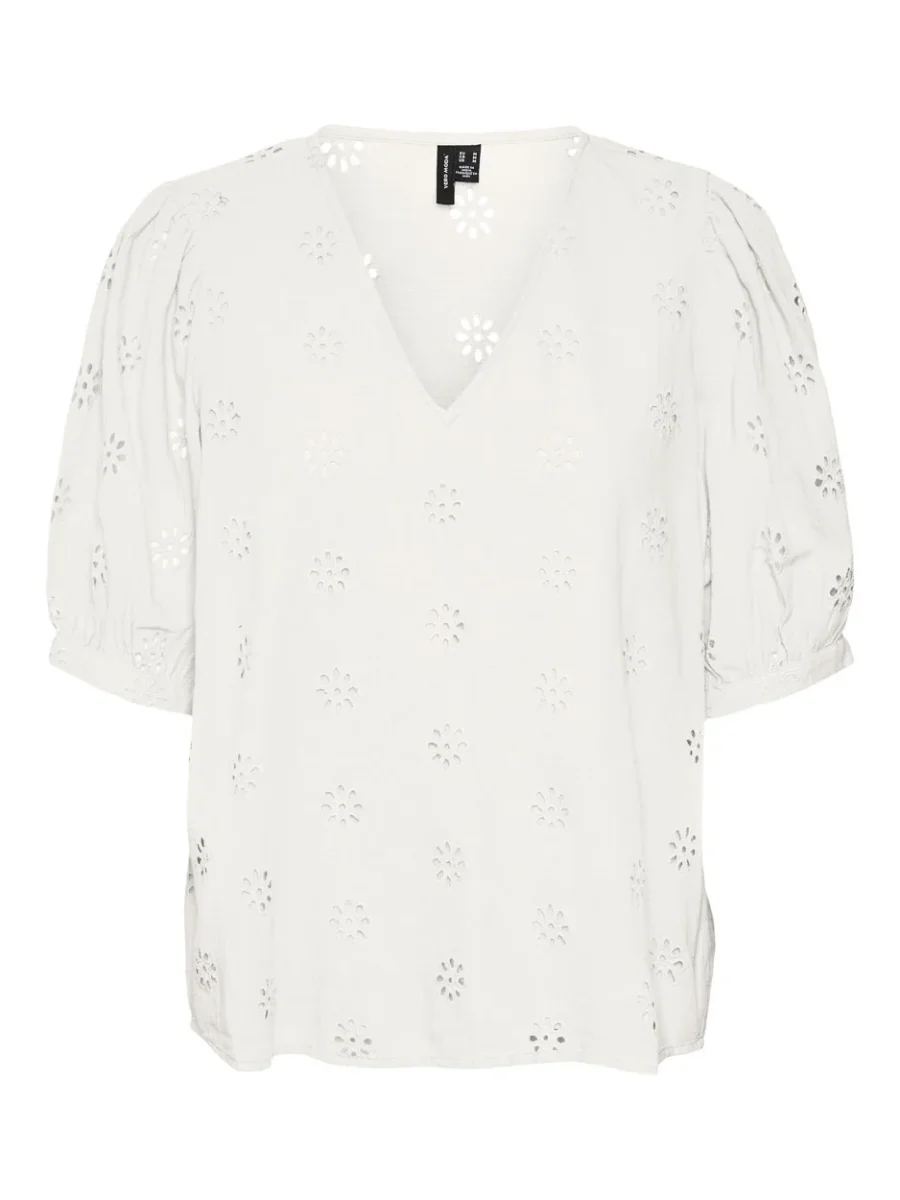 De top heeft een trendy V-hals en een kort pofmouwtje, wat zorgt voor een speelse en vrouwelijke touch. Het prachtige all-over open bloemmotief geeft de top een romantische en zomerse uitstraling. De voorzijde is gevoerd, waardoor de top niet doorschijnt en je de hele dag zorgeloos kunt dragen.