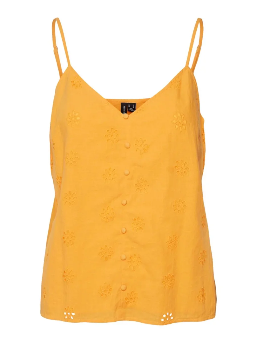 Deze adembenemende okergele singlet van Vero Moda is een must-have item voor elke stijlvolle dame. Het model Maja beschikt over verstelbare spaghetti bandjes en een klein V-halsje voor een vrouwelijke touch. Daarnaast is de top voorzien van een leuk knoop detail aan de voorzijde en een all-over open bloem motief, wat zorgt voor een speelse en trendy look. De voorzijde van de singlet is bovendien gevoerd, waardoor je je geen zorgen hoeft te maken over doorschijnen. De kleur van deze singlet is een prachtige oranje tint, perfect voor het komende zomerseizoen. Gemaakt van 84% katoen en 18% linnen, voelt deze singlet heerlijk licht en luchtig aan op de huid. Voeg deze okergele singlet toe aan je garderobe en creëer eindeloos veel stijlvolle en zomerse outfits. Bestel nu en laat je verleiden door de fantastische kwaliteit en modieuze details van Vero Moda.