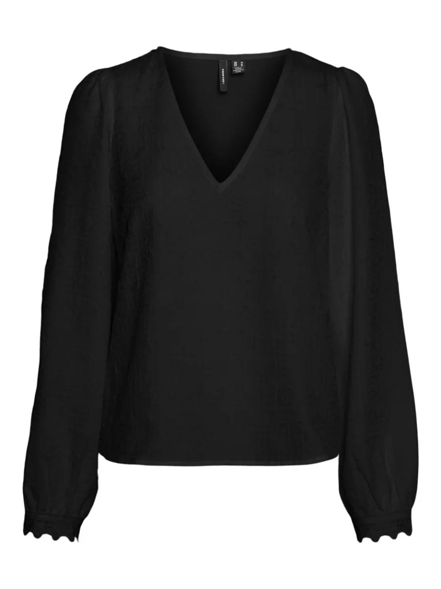 De zwarte kleur van de top zorgt voor een tijdloze look die gemakkelijk te combineren is met andere items uit je garderobe. Daarnaast heeft de top een all-over structuur, wat zorgt voor een speels en uniek contrast. Kortom, met deze Vero Moda top ben je klaar om te stralen!