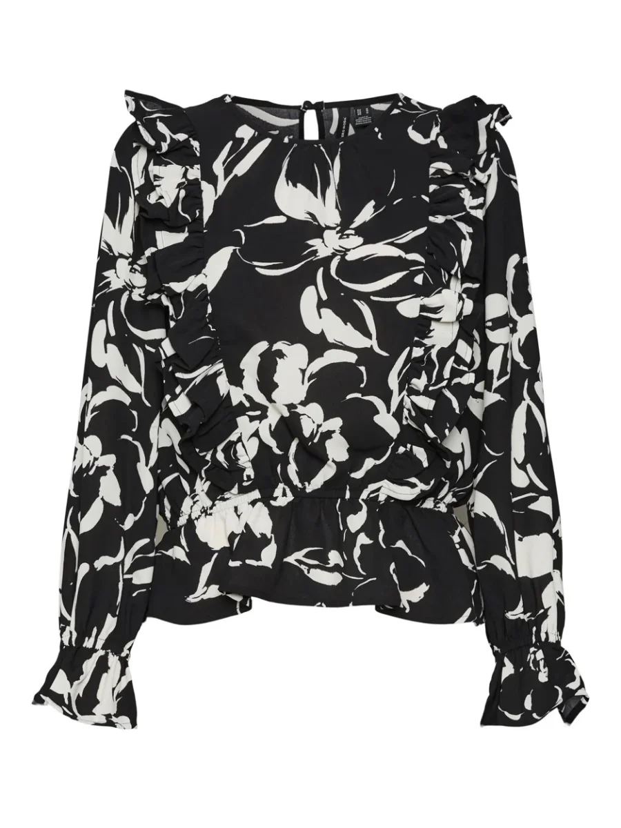 Ontdek deze prachtige zwart dessin top van het merk Vero Moda op onze webshop NummerZestien! Deze elegante top met lange mouwen is perfect voor dames die op zoek zijn naar een stijlvolle en comfortabele toevoeging aan hun garderobe. De top is voorzien van manchetten met elastiek en heeft een mooie v-hals. De regular fit zorgt voor een flatterend silhouet en de ruffles op de voorkant geven de top een speels en vrouwelijk accent. Daarnaast is de top voorzien van een elastieke band in de taille, wat zorgt voor een subtiel getailleerd effect.