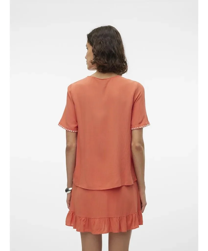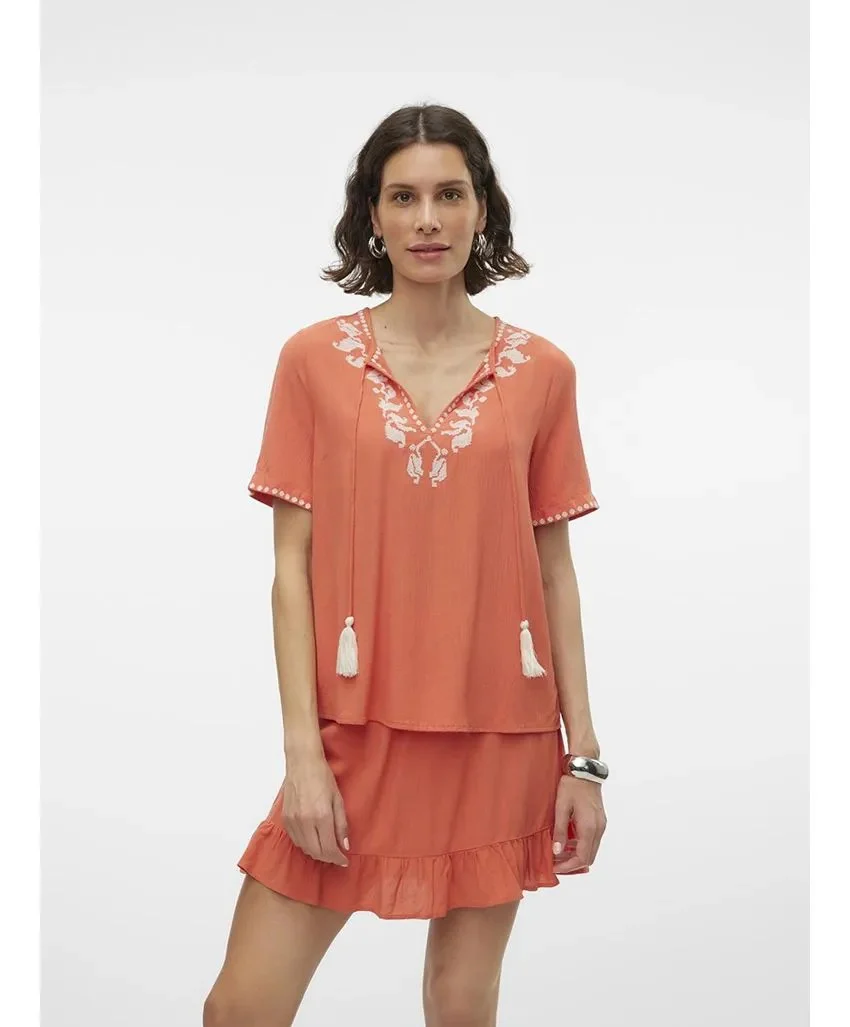 Deze prachtige top van het merk Vero Moda is perfect voor de modebewuste vrouw. De top heeft een mooie brique kleur die perfect past bij het najaarsseizoen. De top is gemaakt van 100% viscose, wat ervoor zorgt dat het comfortabel en zacht aanvoelt op de huid. Dankzij de korte mouwen is deze top perfect voor zowel warmere dagen als voor de wat koelere avonden. De V-hals zorgt voor een elegante touch en maakt deze top geschikt voor zowel formele als informele gelegenheden. Met het tijdloze design en de hoogwaardige kwaliteit is deze top een must-have voor elke kledingkast. Bestel nu en voeg deze trendy top toe aan jouw collectie!