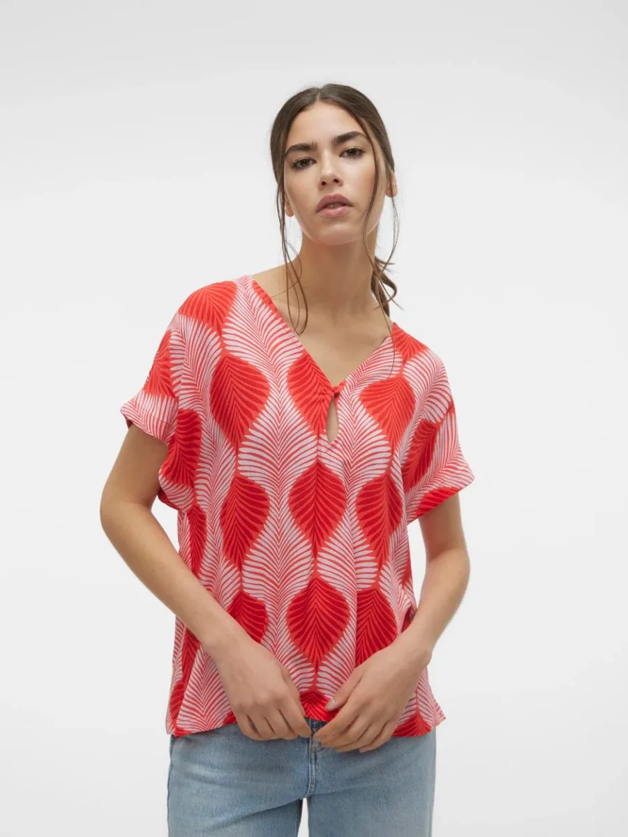 Deze prachtige rood dessin top van het bekende merk Vero Moda is een absolute must-have voor elke trendy dame. Gemaakt van 100% viscose, voelt deze top niet alleen heerlijk zacht aan, maar ziet er ook nog eens adembenemend uit. De stof valt soepel om je lichaam en zorgt voor een comfortabele pasvorm. De rode print met dessin geeft de top een speelse en vrouwelijke uitstraling. Deze top is perfect te combineren met een stoere jeans voor een casual look of met een chique rok voor een elegante uitstraling. Of je nu een dag op kantoor hebt of gaat stappen met vriendinnen, met deze top zal je er altijd stijlvol uitzien. Bestel nu deze top/km dames en voeg een vleugje kleur toe aan je garderobe!